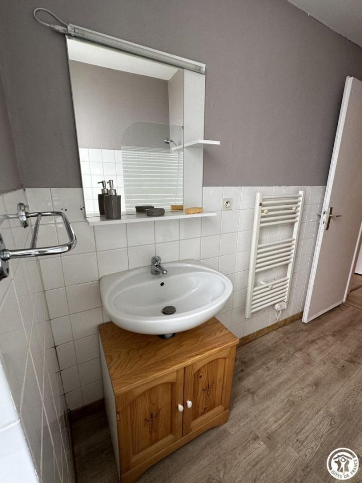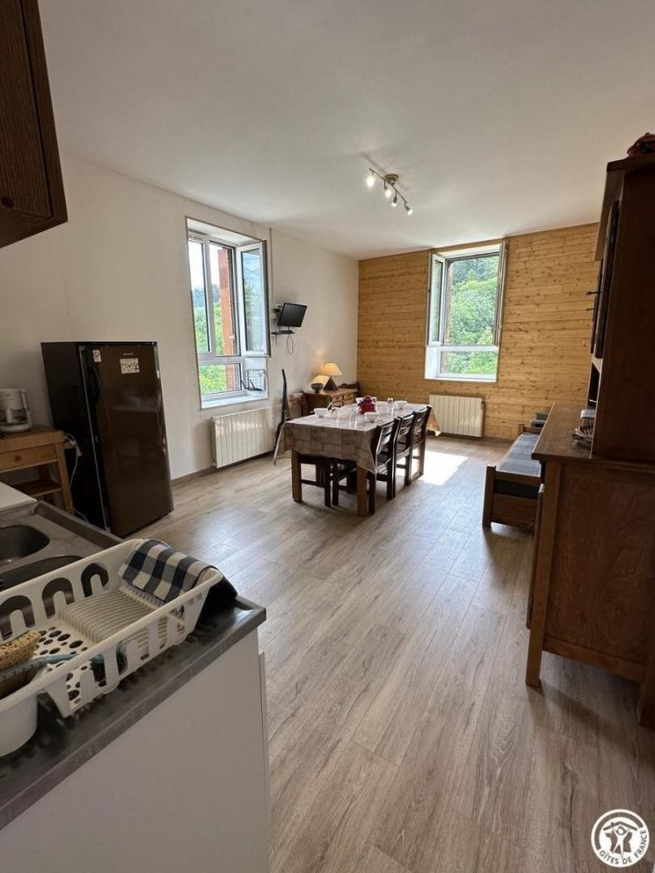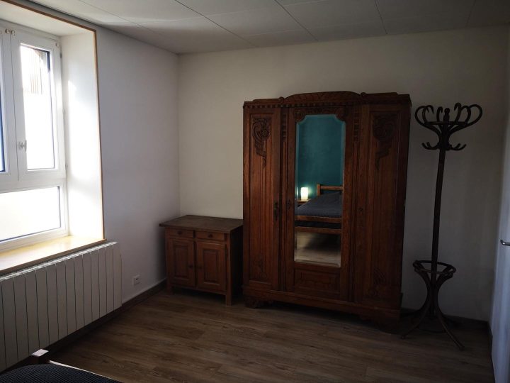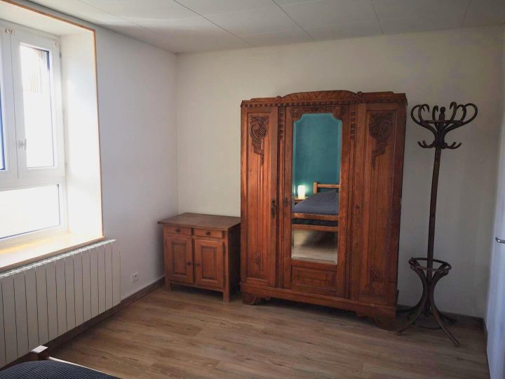 Public building comprising 2 gîtes & another dwelling in peaceful hamlet. Ground floor gîte (74 sq.m.), renovated in 2004. Living room with kitchen area (divan), 2 bedrooms (double bed) (4 single beds), bathroom, WC. Electric heating. TV point.